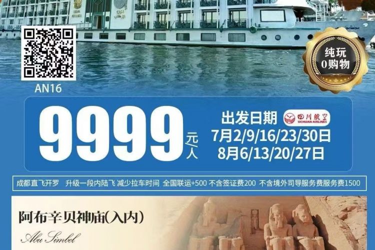 参考航班:去程 成都天府TFU - 开罗CAI 3U3863 01:30 - 05:50 回程 开罗CAI - 成都天府TFU 3U3864 14:45 - 05:00(+1) |
