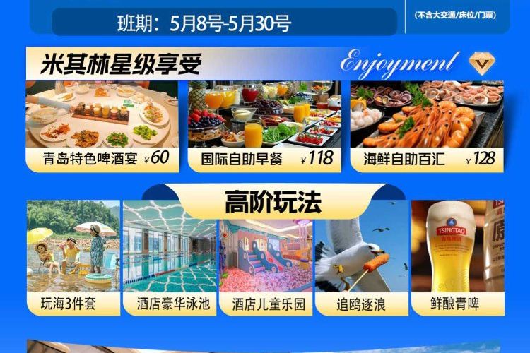 【圣弥厄尔教堂】(外观) 中国唯一的祝圣教堂 ,如果老城区是青岛的真身 ,那么圣弥爱尔大教堂就是这真身的魂灵 ,是德国设计师依据哥特式和罗马建筑风格而设计 ,属新浪漫派。祝圣教堂是专门朝拜上帝的 , 普通教堂是教传诵经的。【五四广场】 因“五四运动”而得名 ,是如今青岛的标志之一。广场正中那形如螺旋般红火风团的雕塑名为“五月的风” ,彰显了庄重、坚实、蓬勃向上的爱国情怀。【奥帆中心】青岛被誉为“帆船之都” ,作为最能体现青岛城市特色和展示城市形象的景区 ,奥帆中心景区内不仅有飞帆渺渺的优雅 ,有青岛十大旧景代表燕岛秋潮 ,有青岛新时代景观鸥翔彩虹 ,更有众多惊险刺激的娱乐体验 ,是游客来青必看的景点。【青岛啤酒纯生之旅】依托国内自动化程度最高、控制手段最先进、 国内单产量最大的纯生生产基地-“青岛啤酒二厂”兴建。始创于2008 年 ,是一座展示青岛啤酒文化喝青岛纯生啤酒生产工艺的现代化工业旅游景点。购买门票 ,赠送 :纯生一杯(0.15L ) +一包啤酒豆 , 18 岁以下的学生只提供无酒精饮品【小麦岛】麦岛属环形岛屿 ,只有一条路与陆地相连 ,与市区隔海相望。整个小麦岛就像是一个花园 ,有大片平坦宽广的绿化草地 ,远处就是湛蓝的海水 ,保留着原生态的环境。沿着小岛的游览步道 ,可以 360度欣赏海景 ,也可眺望到遥远的海岸线。【小众赶海】只有青岛人才知道的宝藏赶海地 ,人少沙滩好 ,夏天没有浒苔哦 ,带娃轻松自在。赶海是经常性的活动,吹着海风,收获多少不重要,重要的是参与其中的过程。小鱼、小虾、小蛤蜊、小螃蟹……蛤蜊很多 ,就算是新手 ,一铲子下去也会直呼过瘾!赶海的乐趣在于有了第一次就会有无数次。赶的是心情 ,捡的是快乐 ,挖的是高兴。挖到什么不重要 ,重要的是挖。特别说明 :赶海时间需要根据潮汐落潮时间灵活体验 ,可能会遇上落潮时间太早或太晚(此为灵活体验项目 ,会根据当天的潮汐时间对行程游览顺序稍作调整)下午入住海边高端5星级海边泳池酒店。酒店出门过马路就是大海 ,踏浪自由行 ,夜幕降临 ,可看到海上摩天轮的浪漫旋转。对着大海发呆 ,浪漫漫步 ,海边拾取 ,孩子撒欢 ,享受海边亲子度假时光。玩累了 ,可以随时回酒店洗澡 ,换衣 ,另外酒店还有全方位室内泳池、健身房 ,儿童乐园供您免费娱乐。用餐无忧 ,平价美食广场或酒店内想用地道青岛菜,行程结束后入住酒店休息。晚餐敬请自理